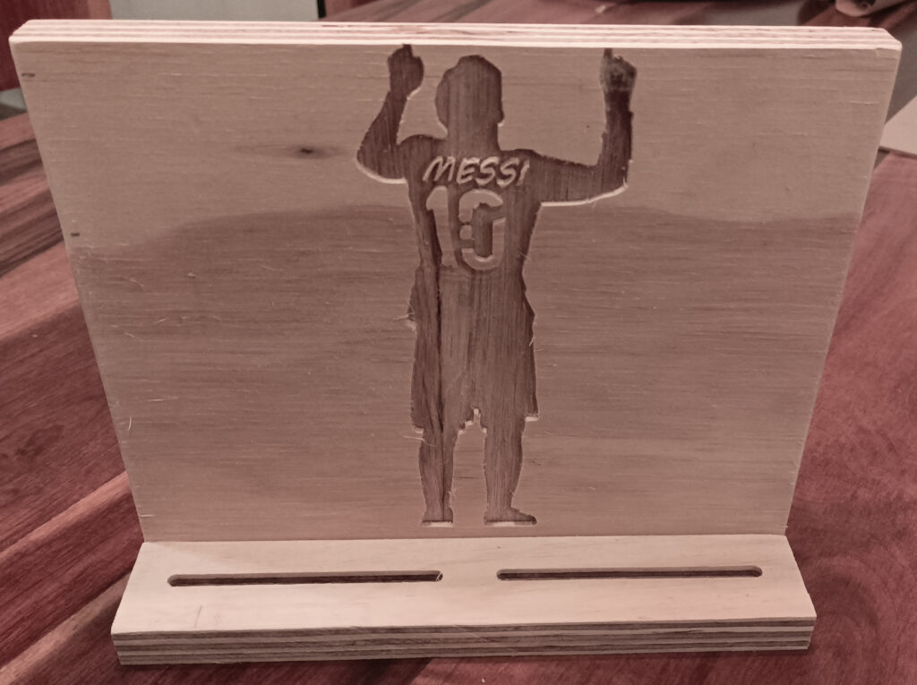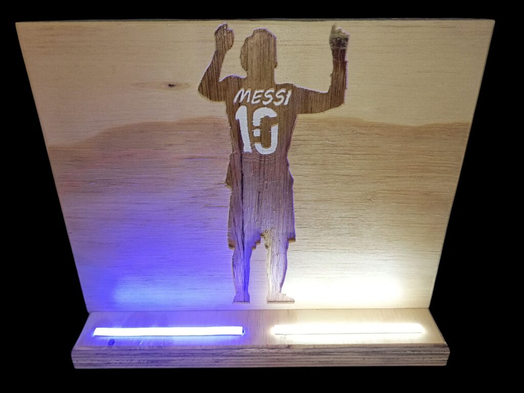 Cuadro de Messi tallado sobre madera multilaminada laqueada, montado sobre una base de 250x10mm, que lo ilumina de azul y blanco.