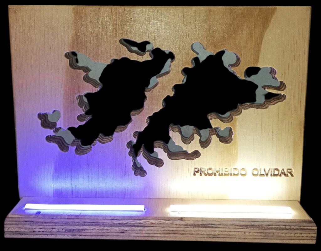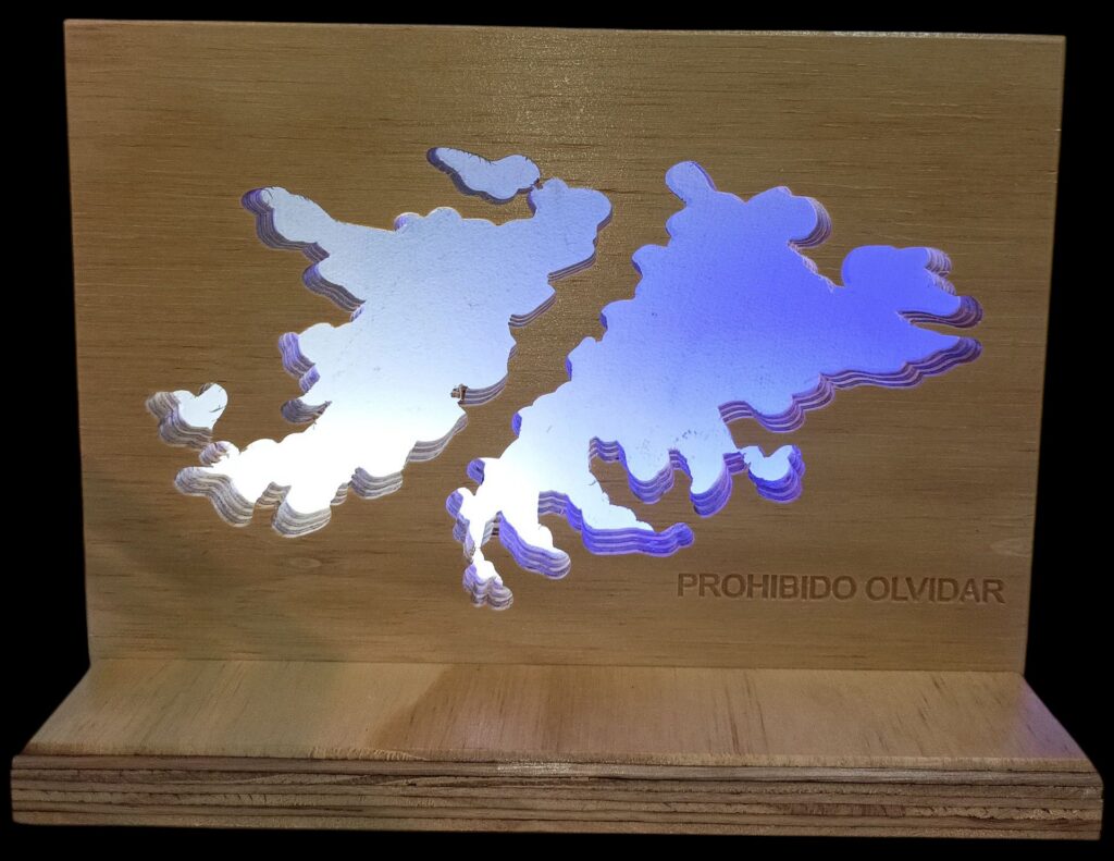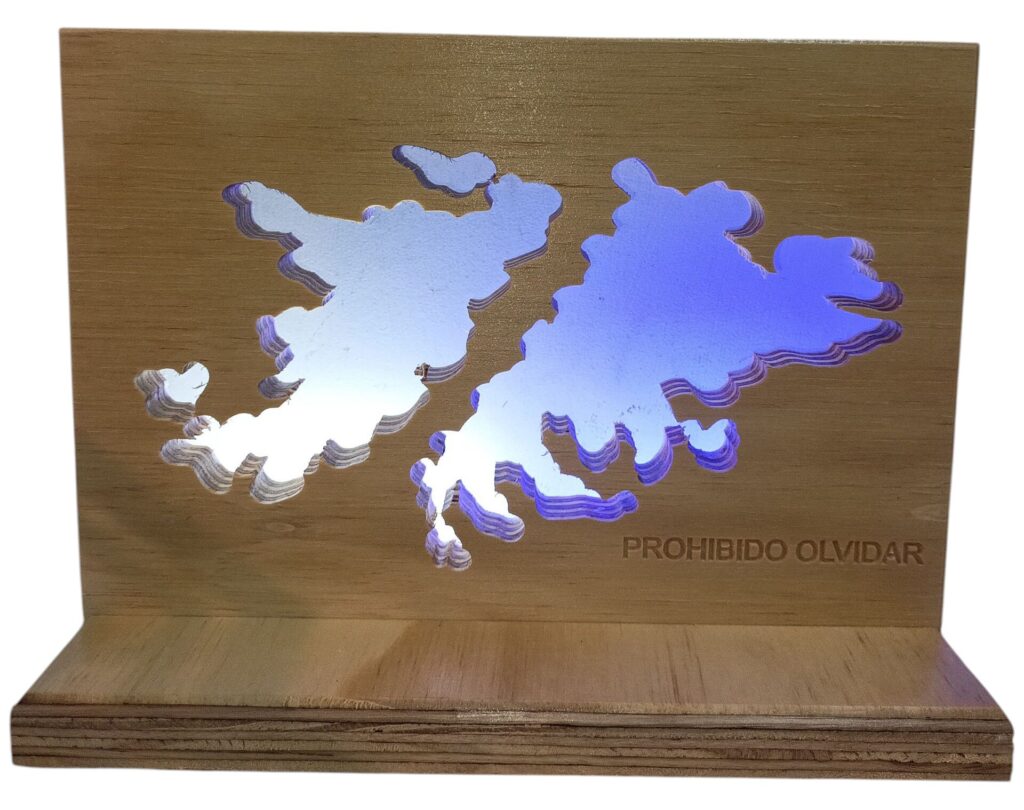 Cuadro malvinas, sobre madera multilaminada laqueada, montado sobre una base de 250x10mm, que lo ilumina de azul y blanco. La base puede también colocarse con los neones de fondo, para que se distinga la iluminación azul y blanca por detrás de las Malvinas.